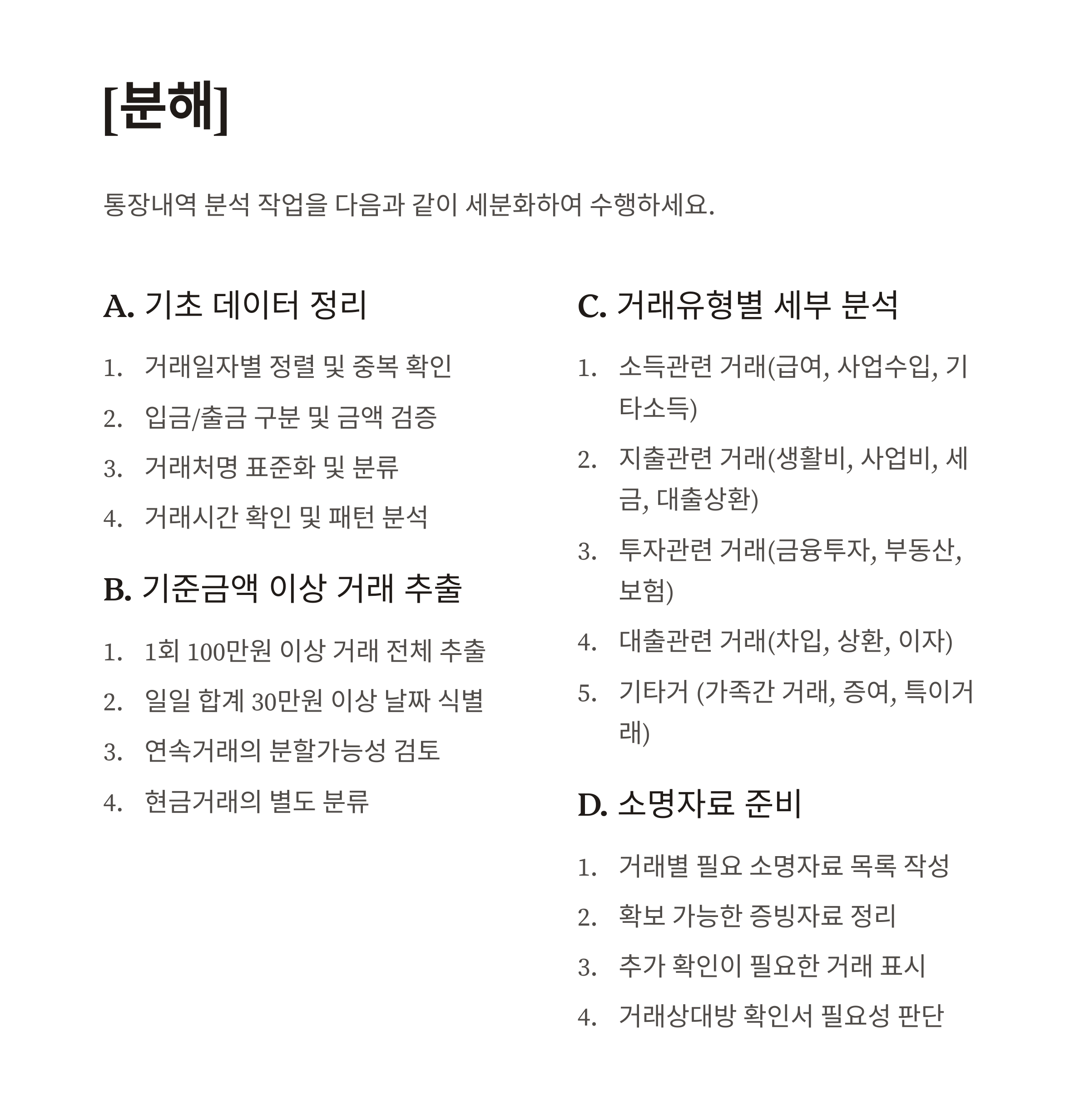 - 세무신고와의 일치성 검증: 종합소득세 신고 소득과 통장입금의 정합성 확인