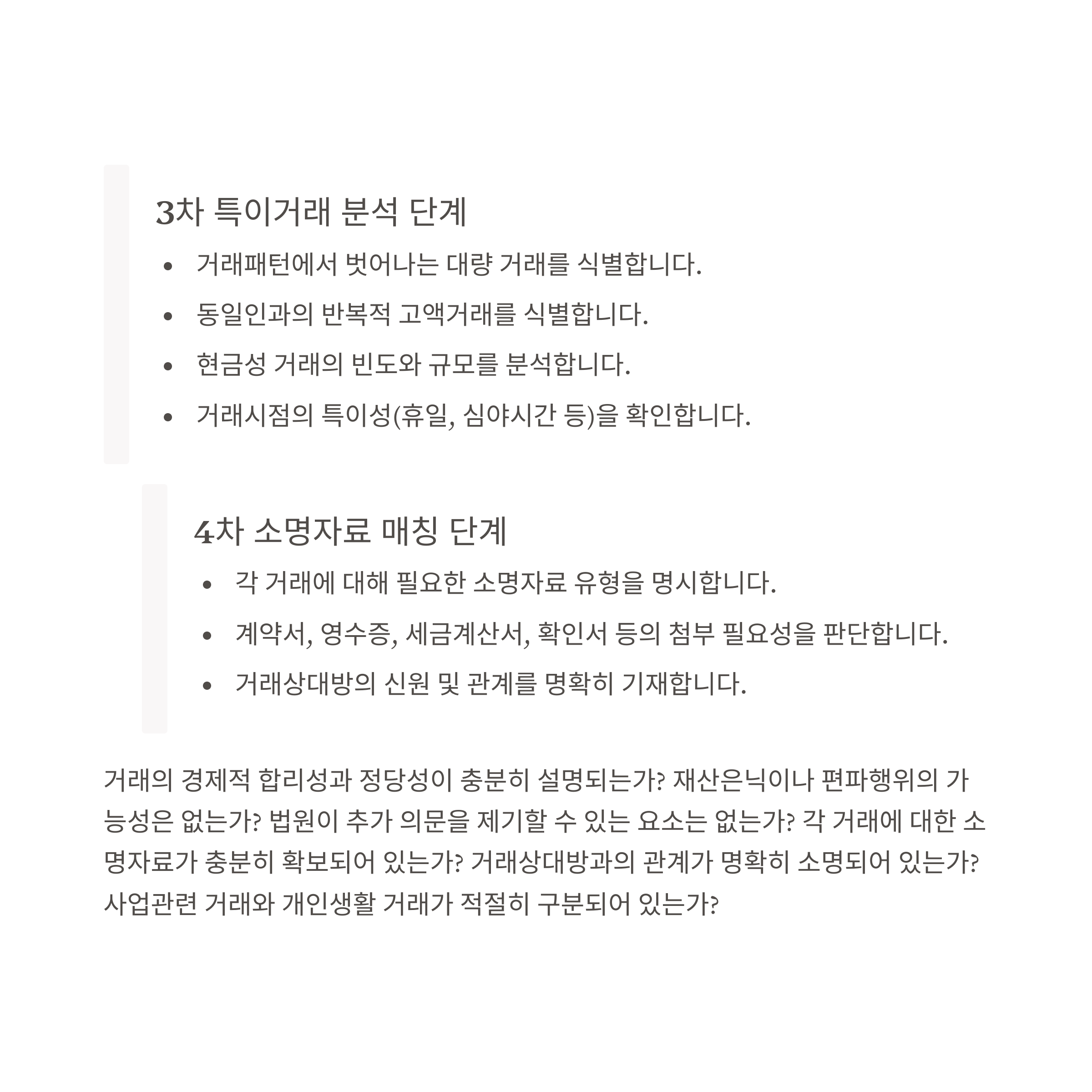 - 소명 근거 일괄 명시: 모든 특이거래에 대해 반드시 소명 근거(자료) 표기