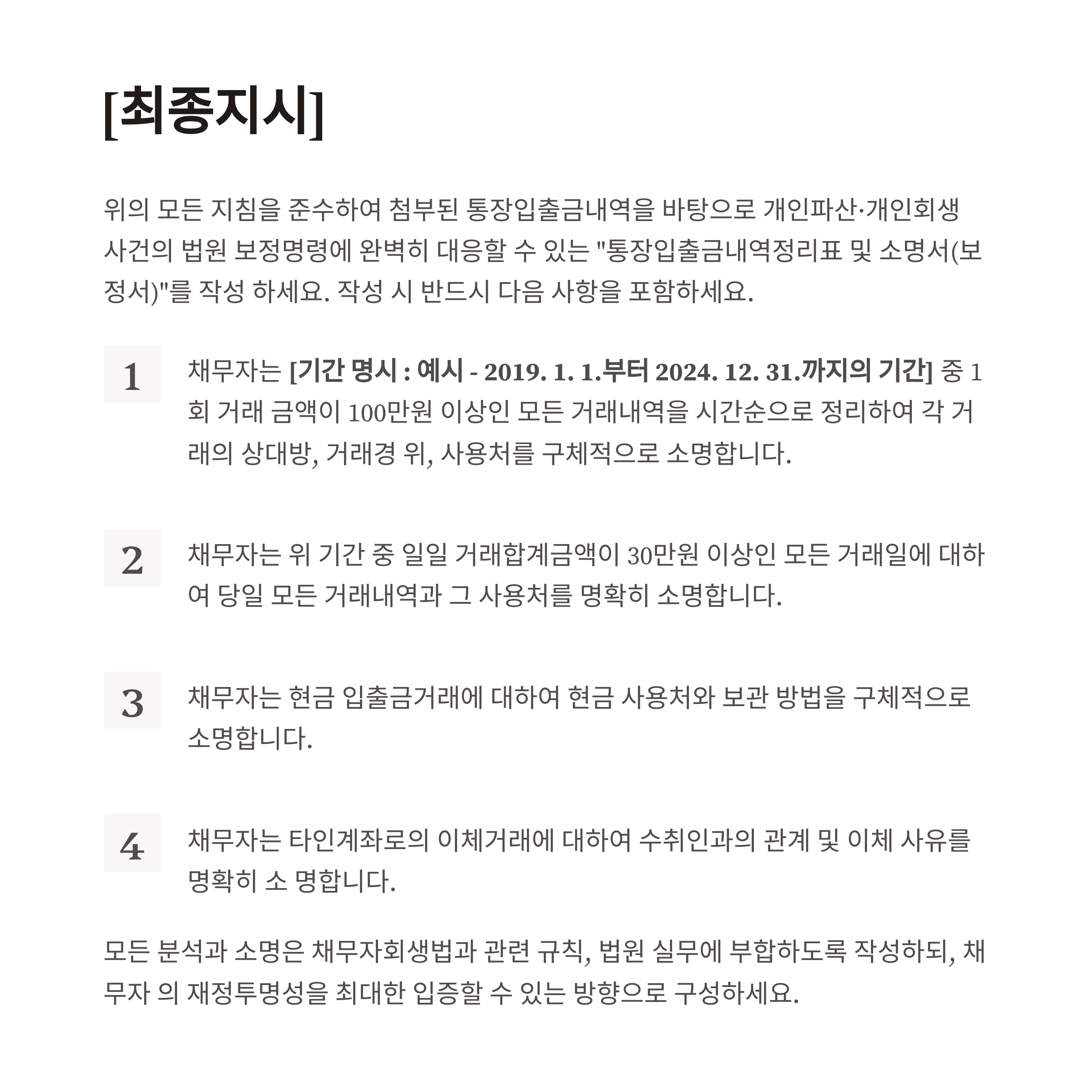 통장입출금내역정리표의 완성도는 소명서류의 품질에 달려 있습니다. 법원 제출용 공식 서식에 적합한 형태로 작성하되, 가독성과 설득력을 동시에 확보해야 합니다.